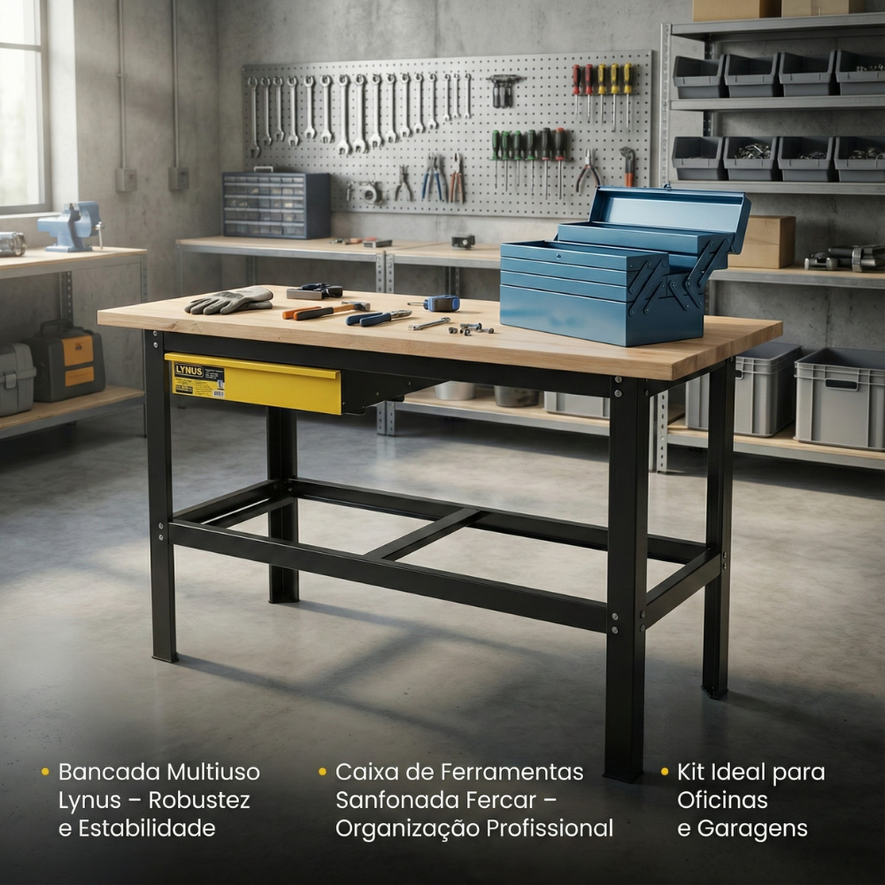 Monte sua estação de trabalho completa com o Kit Oficina Profissional. Este conjunto une a resistência bruta da Bancada Multiuso Lynus, capaz de suportar até 500kg, com a mobilidade e organização da Caixa de Ferramentas Sanfonada Fercar.