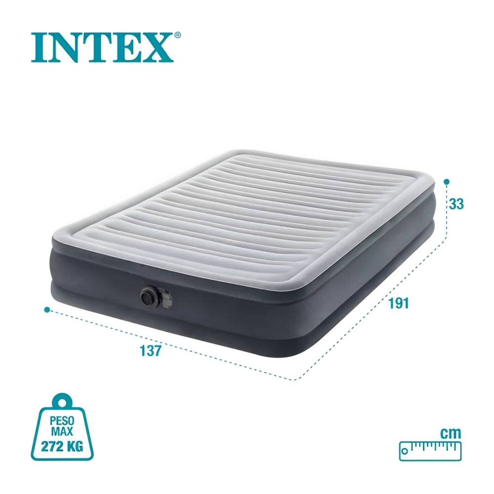 * CONFORTO DE CAMA REAL (FIBER-TECH): O Colchão Intex possui estrutura interna com milhares de fibras de poliéster que não deformam, garantindo suporte firme para a coluna e suportando até 272 kg.