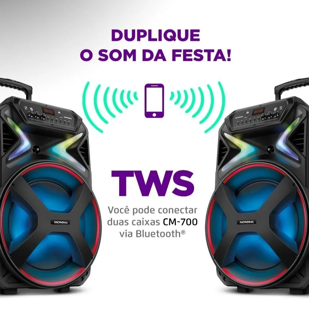DUPLIQUE O SOM DA FESTA: A função TWS (True Wireless Stereo) permite conectar duas caixas amplificadas CM-700. E o melhor: sem o uso de fios.
