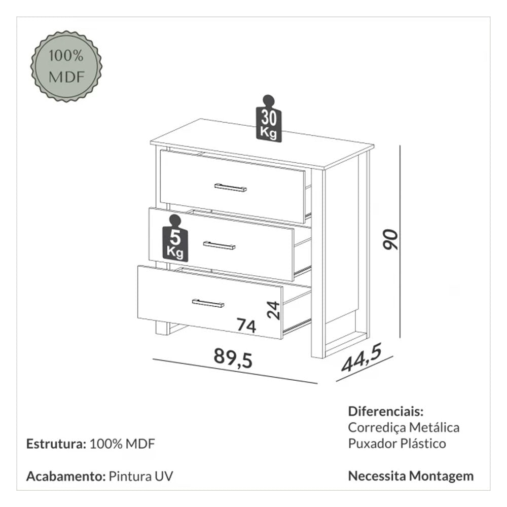 A Cômoda Industrial toda em MDF. Produto moderno e sofisticado, de fácil combinação com os demais complementos do ambiente. O produto possui 3 gavetas com puxadores de plastico e excelente espaço interno.