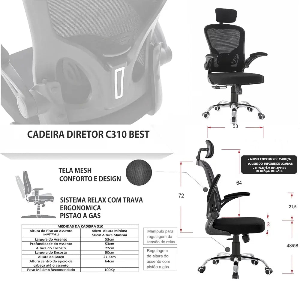 Seu material é resistente, com base em aço cromado, revestimento em Tela Mesh, espuma laminada, apoio para braços com elevação e regulagem de altura e amortecimento a gás . para maior conforto essa cadeira conta apoio de cabeça ajustável e sistema relax com travas.