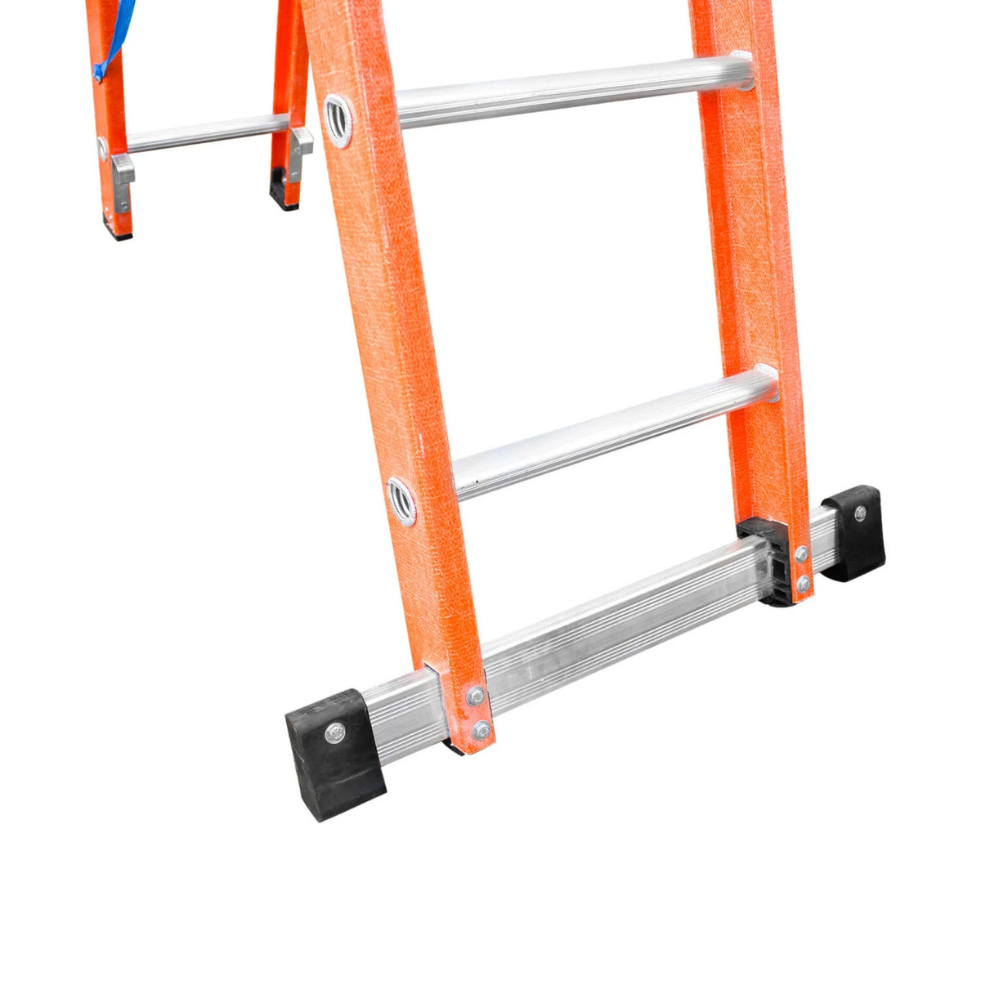 Escadas profissionais como esta são projetadas para serem robustas. O peso exato pode variar, mas a combinação de fibra e alumínio busca um equilíbrio entre resistência e manuseabilidade. É mais pesada que uma escada doméstica, mas gerenciável para o transporte por um profissional.