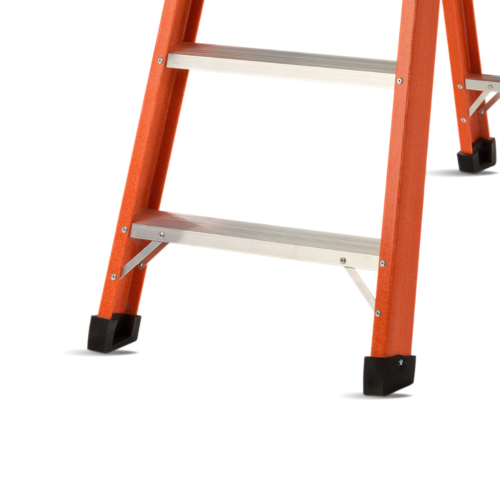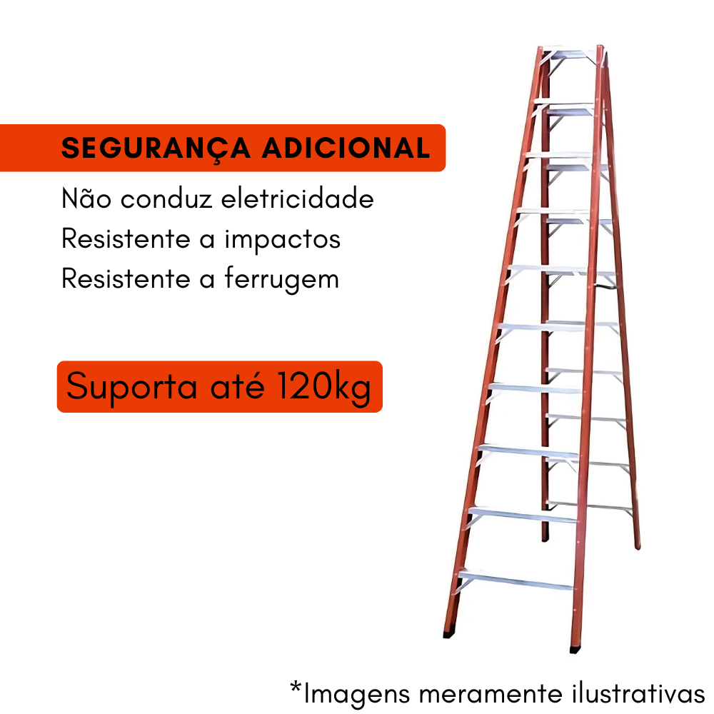 A principal vantagem é o isolamento elétrico. A fibra de vidro não conduz eletricidade, tornando esta escada a opção mais segura para eletricistas e profissionais que trabalham perto de redes ou equipamentos energizados.