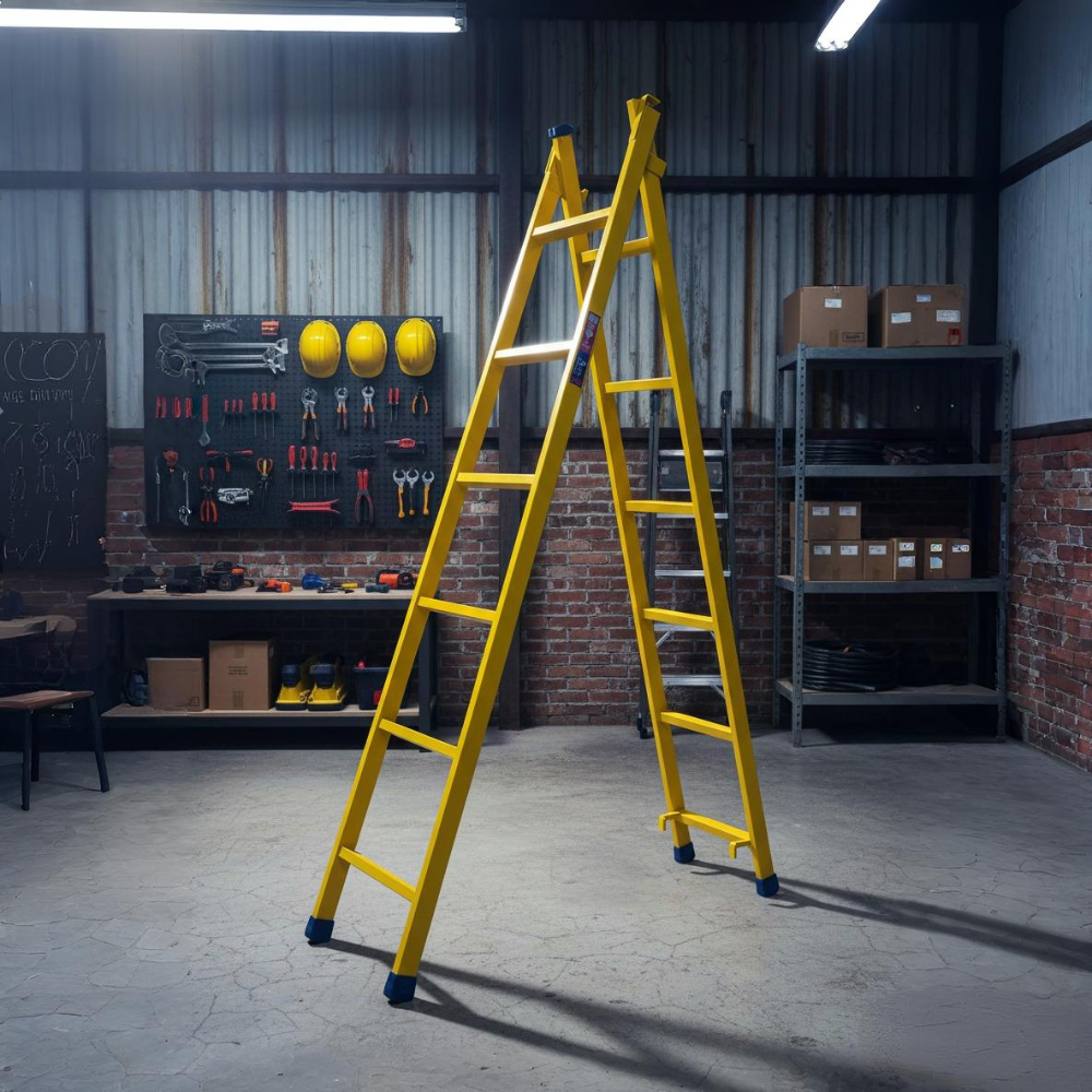 * ALTA RESISTÊNCIA: Escada fabricada em Aço Carbono com pintura eletrostática amarela, suportando até 120 kg e oferecendo proteção extra contra corrosão.