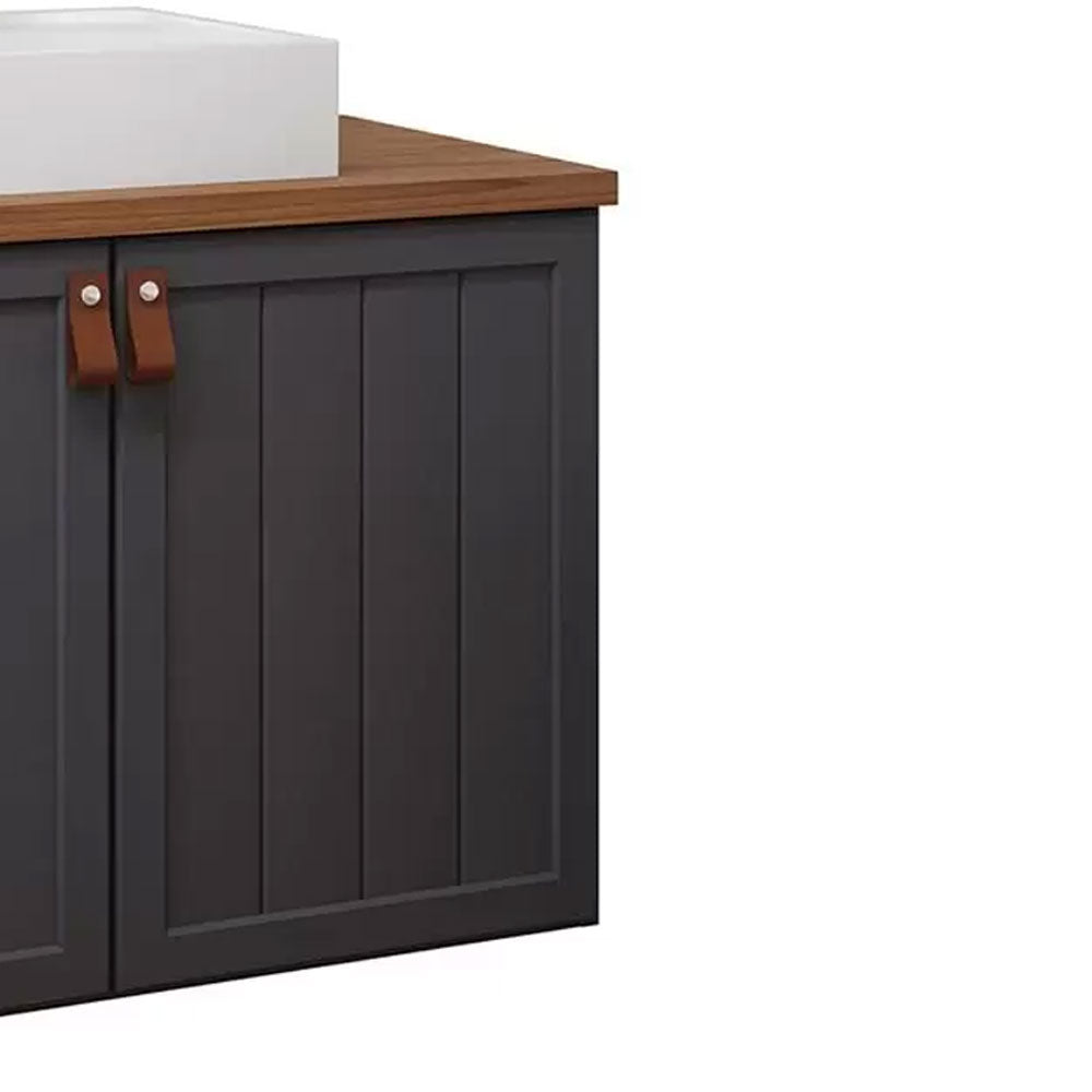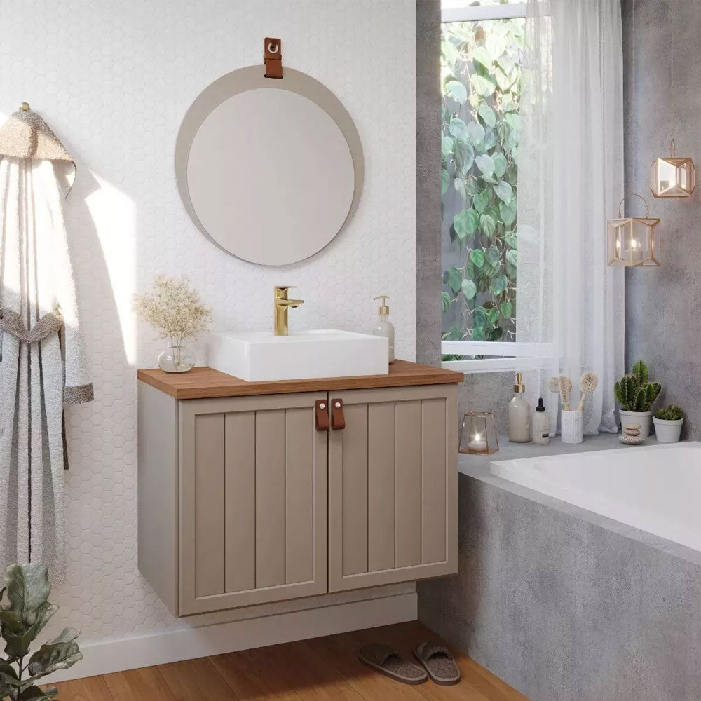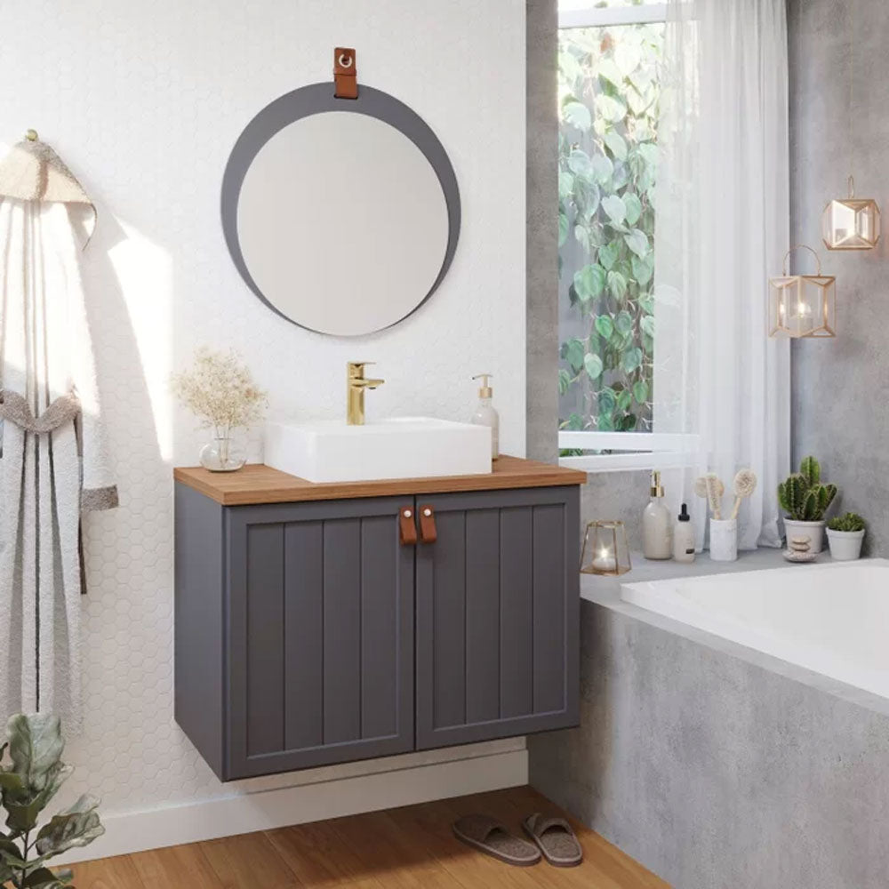 O gabinete é suspenso, o que facilita a limpeza do piso do banheiro. Além disso, vem montado e pronto para uso, o que torna a instalação muito mais fácil.