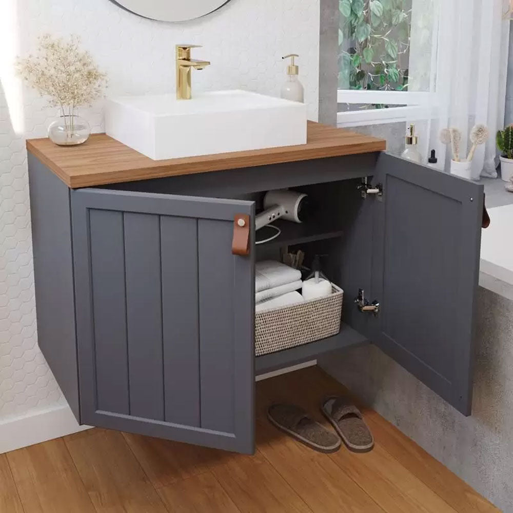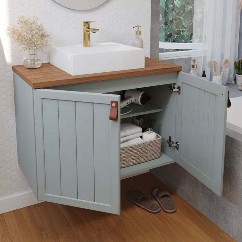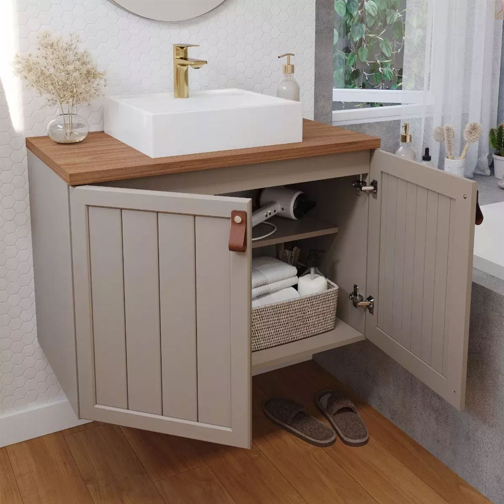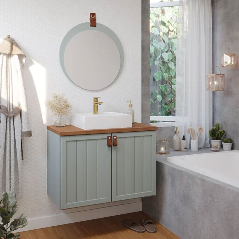 O gabinete é suspenso, o que facilita a limpeza do piso do banheiro. Além disso, vem montado e pronto para uso, o que torna a instalação muito mais fácil.