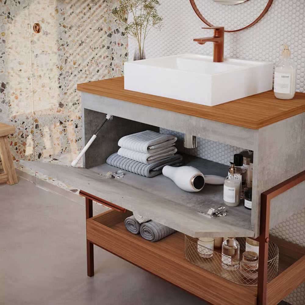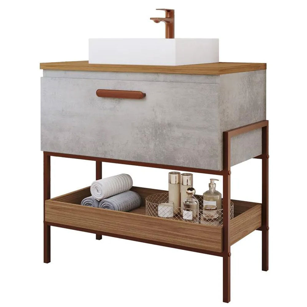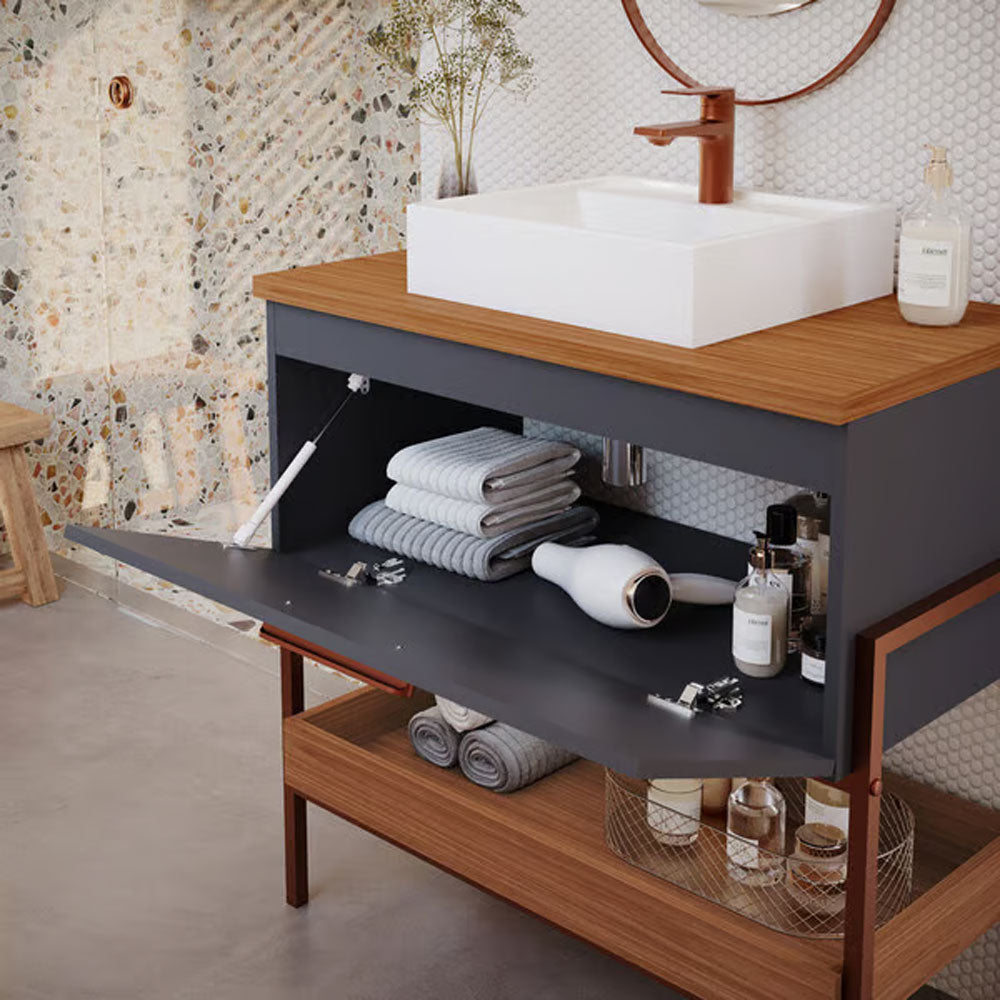 O Armário para Banheiro com Cuba da linha Portinari da MGM Móveis possui estrutura 100% MDF na cor Titanium e Freijo, tem tamanho de 65x93cm e profundidade de 45,1cm. Possui puxador em ABS, porta basculante com pistão a gás. O armário conta com 1 porta e 1 puxador.