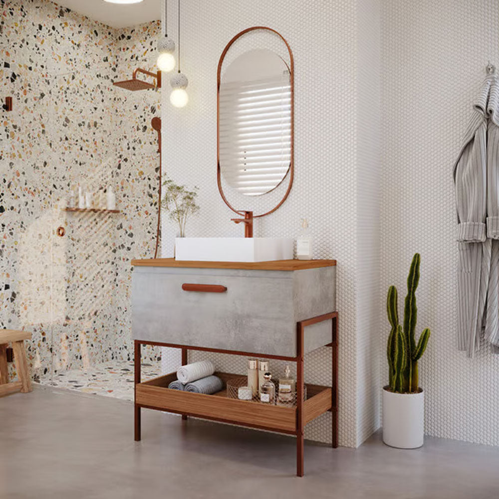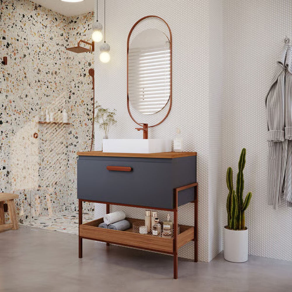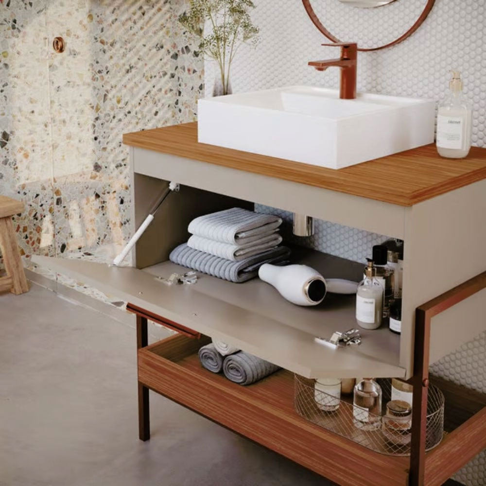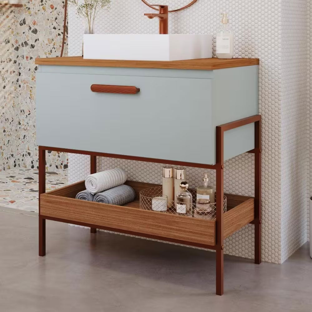 O Armário para Banheiro com Cuba da linha Portinari da MGM Móveis possui estrutura 100% MDF na cor Titanium e Freijo, tem tamanho de 65x93cm e profundidade de 45,1cm. Possui puxador em ABS, porta basculante com pistão a gás. O armário conta com 1 porta e 1 puxador.