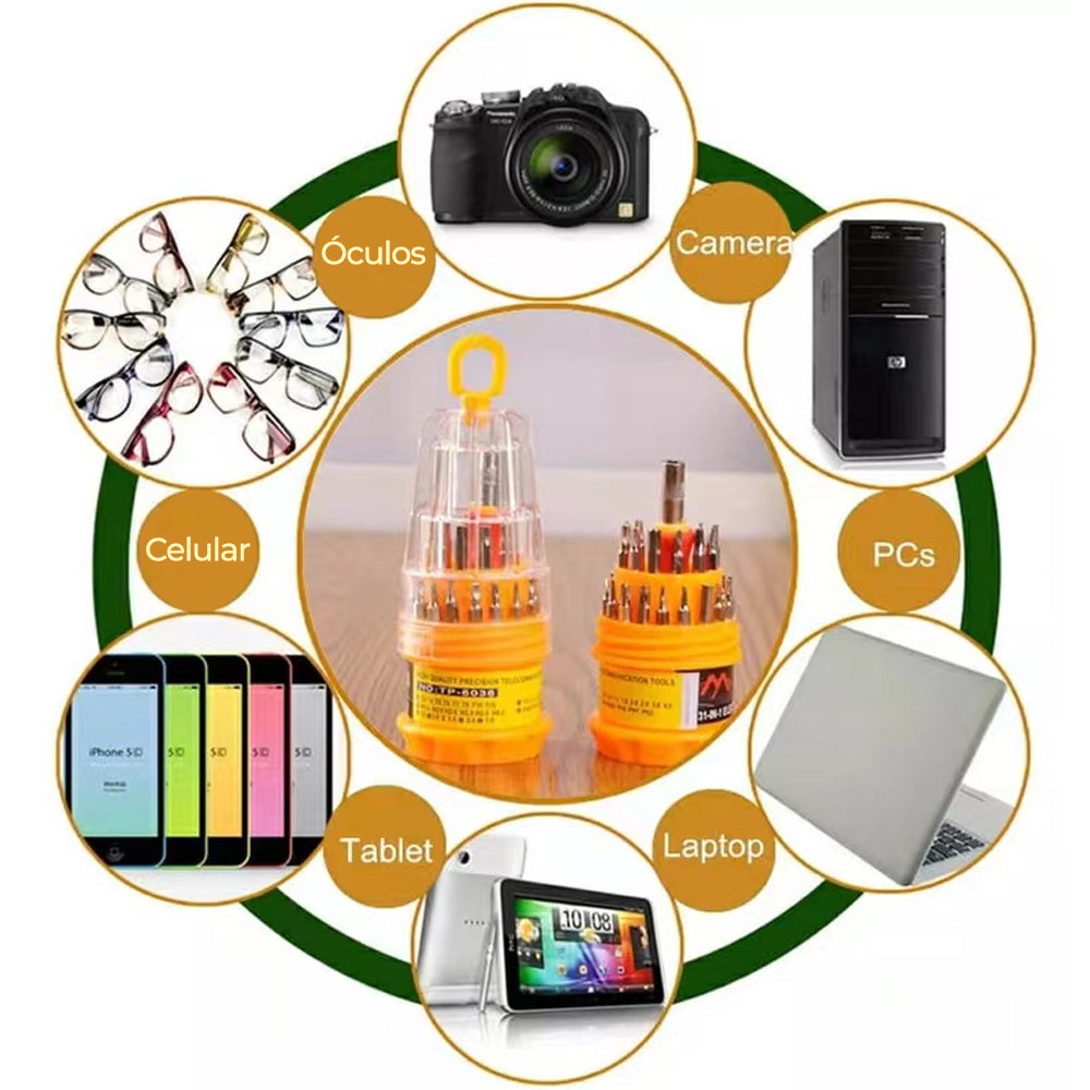 IDEAL PARA CELULARES, ÓCULOS, REL ÓGIOS, TELEFÓNIA, COMPUTADORES, V ÍDEO-GAMES E ELETR ÔNICOS EM GERAL QUE POSSUAM PARAFUSOS DO TIPO FENDA, TORX, ALEN, PHILIPS, ESTRELA, ETC.
