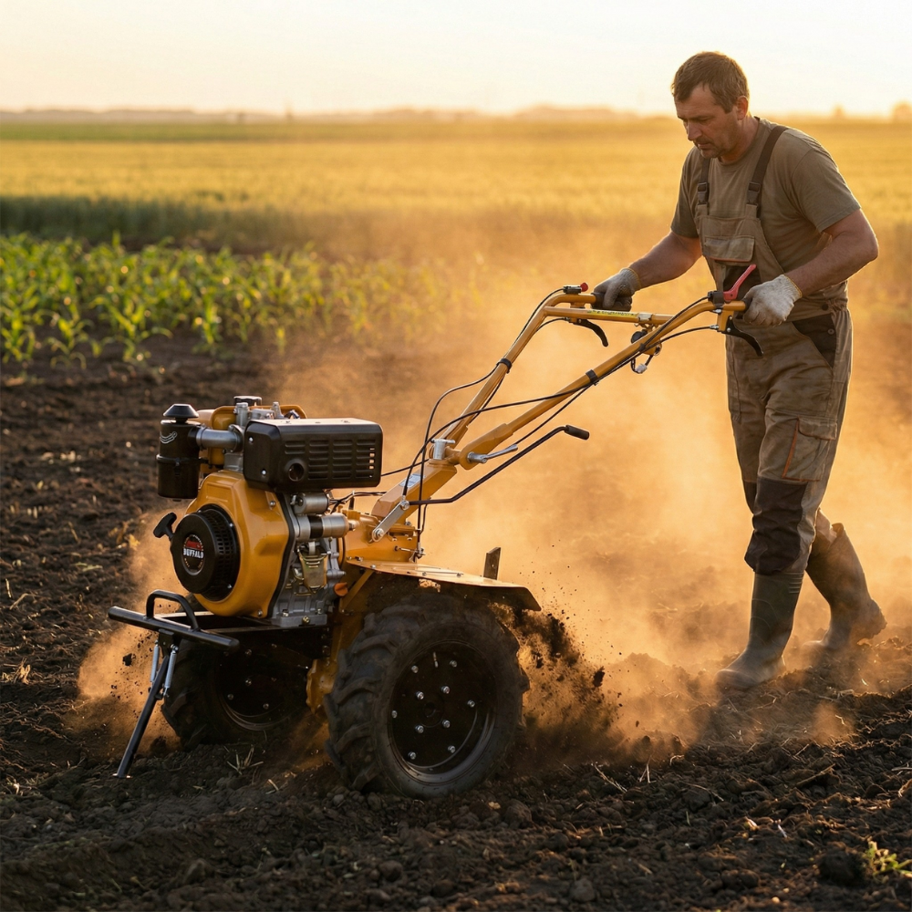 Eleve a produtividade no campo com o Motocultivador Buffalo BFD 1120 PLUS (Diesel). Desenvolvido para a agricultura profissional, este tratorito é a solução definitiva para quem precisa de força bruta para arar, cultivar e preparar o solo em grandes áreas, como sítios, hortas comerciais e aviários.