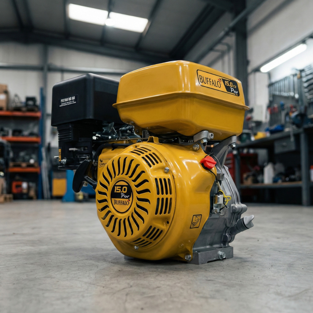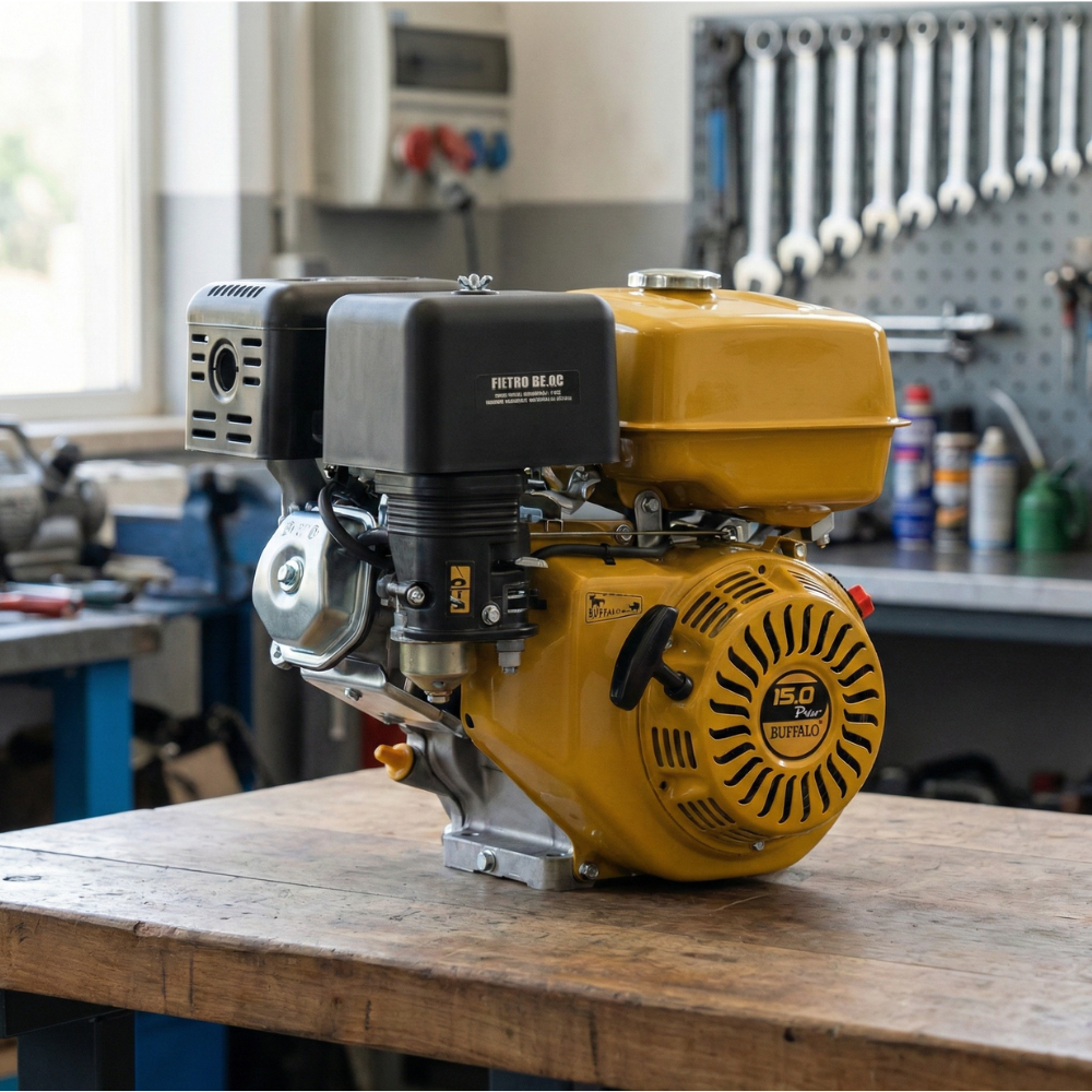 Sua construção segue o padrão de qualidade Buffalo: bloco em alumínio injetado, camisa de ferro fundido para maior durabilidade e carburador com boia para funcionamento estável. O eixo horizontal de 1 polegada (25,4mm) garante compatibilidade universal com polias e acoplamentos.
