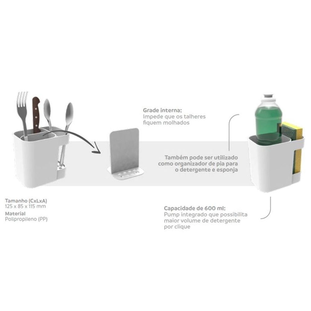 Organizador de pia e porta talheres em um único produto! Duas possibilidades de uso, design exclusivo, livre de bisfenol (BPA FREE), porta-esponja com escorredor e grade interna removível para armazenar os talheres enquanto eles secam. Organizador de pia ideal para oferecer para os seus clientes quem busca mais praticidade para rotina dentro de casa.