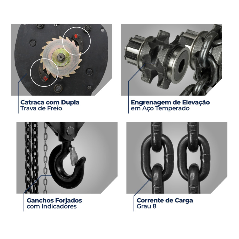 4. Dupla roldana, guia da corrente em aço temperado, e dupla trava de segurança.