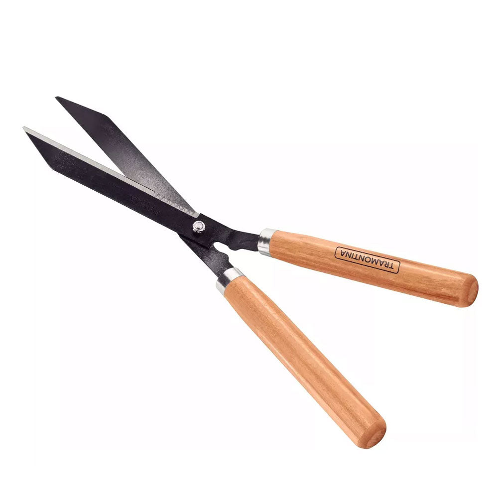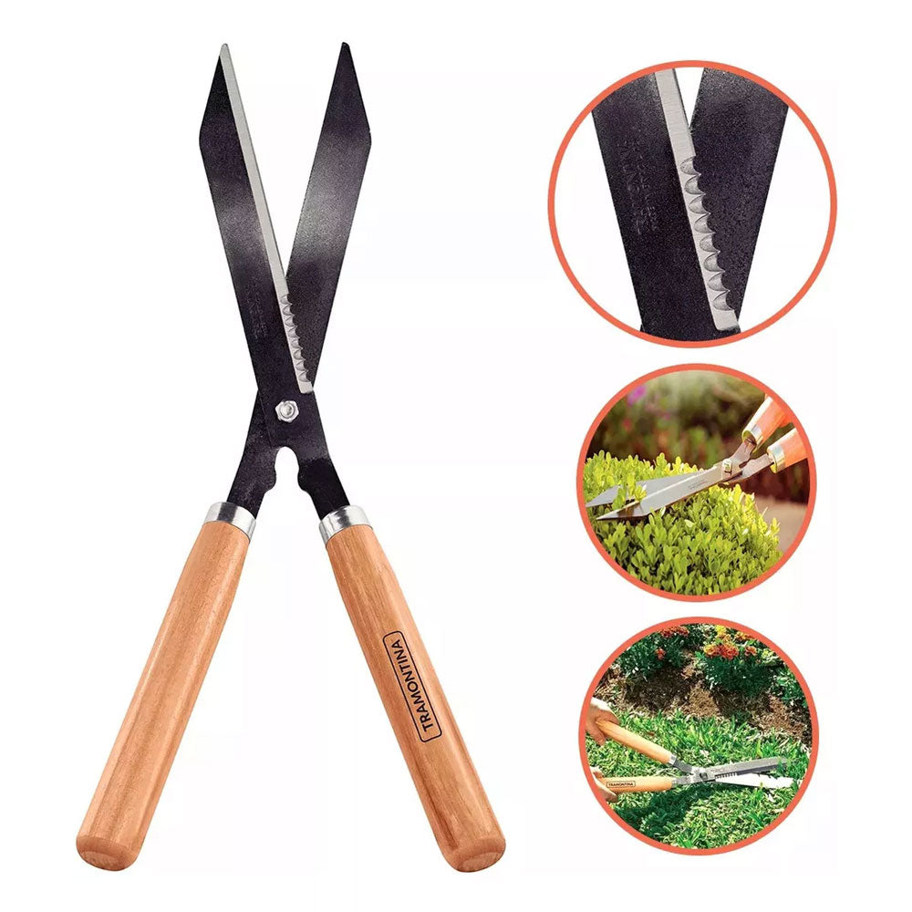 Um jardim com belas plantas, grama, cerca viva e flores dão aquele toque gostoso de natureza em nossa casa, mas exigem manutenção. E para que você consiga apreciar todos os benefícios proporcionados por essas lindas plantas, é necessário ter a ferramenta certa para apará-las. Por isso, você precisa conhecer a tesoura para cerca viva Tramontina com lâmina serrilhada metálica e cabo de madeira. Sua lâmina serrilhada de alta qualidade irá facilitar o corte ou desbaste de arbustos e grama. E se você tiver um talento artístico poderá utilizá-la para a topiaria e deixar o seu jardim com os mais variados formatos de corte e acabamento. Com ela, seu jardim irá ficar muito mais bonito!